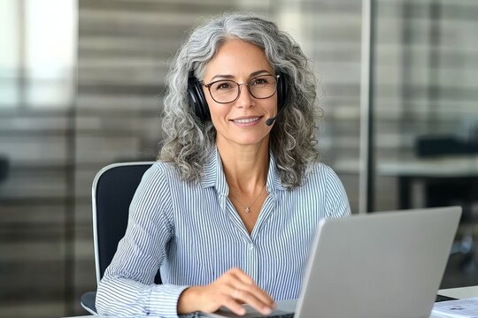 Happy middle aged woman customer service representative with headset smiling at desk in modern office