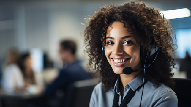 Smiling female call-center agent wearing a headset and providing professional customer support in a modern office environment, emphasizing effective communication and client assistance