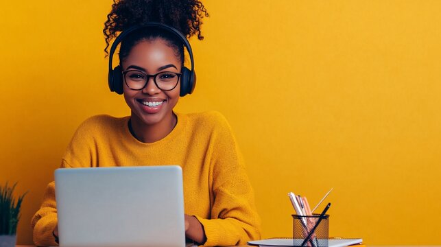 A customer service representative wearing a headset, smiling while sitting at a desk with a laptop and notepad, light solid color background