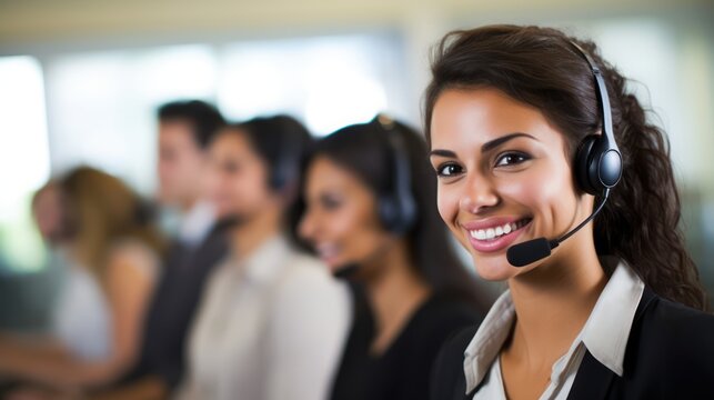A customer service representative in a modern call center, wearing a headset, smiling while helping a customer on a computer screen, bright and professional setting