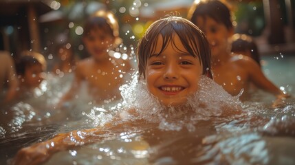 Children having fun bathing and playing in the pool under the sunlight
