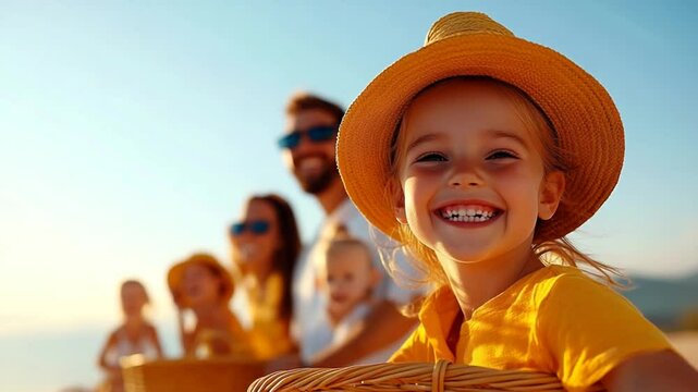 Joyful child with bright hat smiling against sunset on beach, surrounded by family enjoying sunny day at the coast