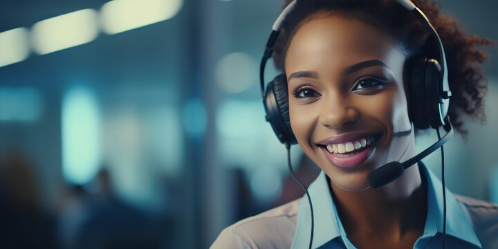Cheerful black woman customer support representative ready to assist.