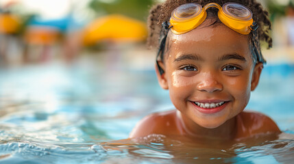 A little black boy with swim goggles on his forehead, smiles brightly in an outdoor swimming pool. Perfect for promoting summer holidays, happy childhood and swimming lessons.