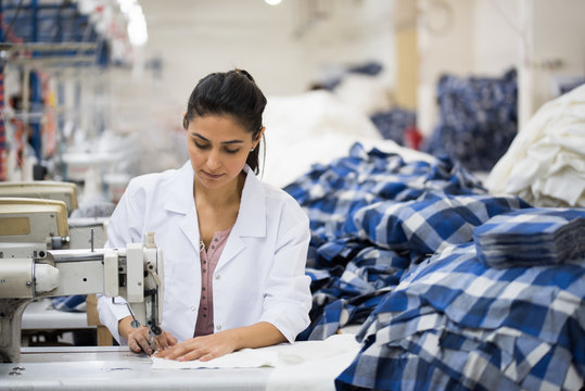 Smiling Indian Woman Tailor in Traditional Attire Working with Sewing Machine