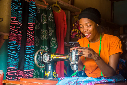 young african female tailor smiling while viewing content on her mobile phone sitting with her sewing machine