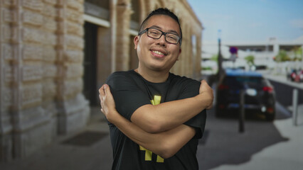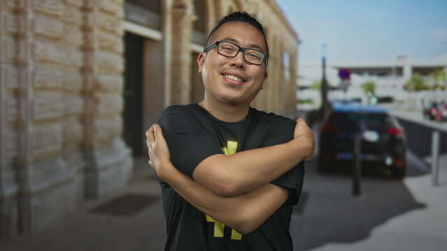 Woman holds open palms at outdoor souvenir market street stall while smiling broadly; warmth.