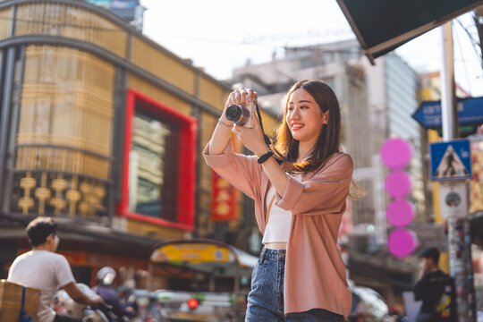 Happy adult asian woman traveler using digital camera travel in southeast asia at outdoors on day