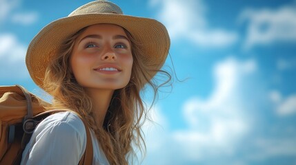 A solo female traveler enjoying a sunny beach vacation, smiling with a relaxed expression, wearing a hat and sunglasses, with the blue sky in the background.