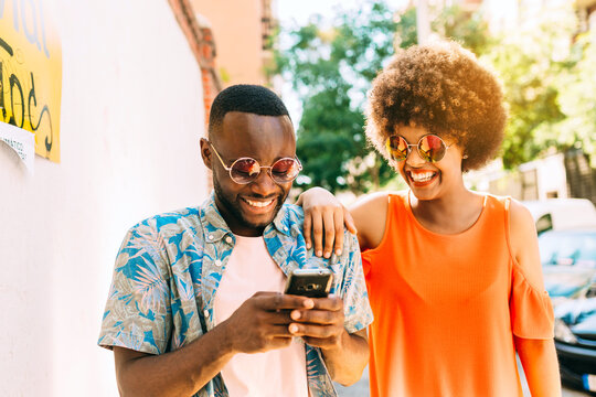 Cheerful black couple using smartphone on street