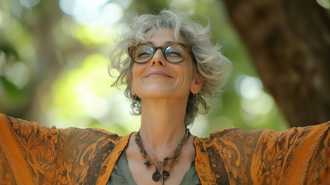 joyful middle aged woman with curly hair enjoys nature, arms outstretched, embracing life. Her vibrant outfit and glasses reflect her free spirit and happiness