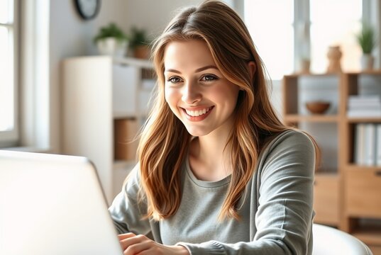 Young Woman Engaged in Remote Work with Laptop in Bright Home Office Setting