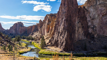 Blue river flowing in the valley against the background of sharp rocks. Smith Rock state park, Oregon