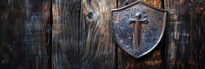 Grey metal shield on dark wooden background. Wide photorealistic banner with copy space. Security, protection, medieval and smithy concept.
