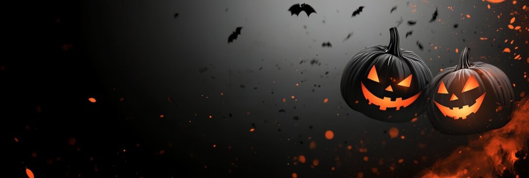 A Halloween themed poster with two pumpkins and bats. The poster is black and white with orange and black colors