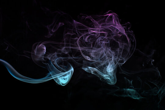Multicolored smoke for aromatherapy relaxation on black background, beautiful swirled puffs of smoke