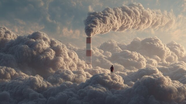 Man standing before a smokestack emitting pollution into the atmosphere