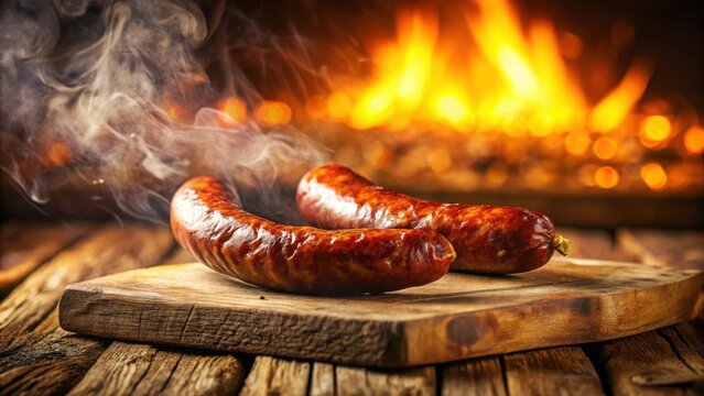 Smoked sausages resting on a rustic wooden cutting board, exuding savory aromas and a hint of smoky fire, creating a tempting culinary image.