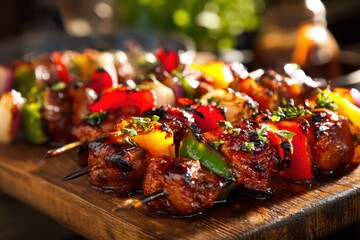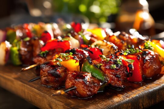 Grilled satay skewer street food smoky barbecue spicy marinade charcoal grill meat skewer golden crust savory snack food stall night market with warm aroma and lively vibe
