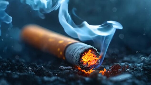 Close-up of a Smoldering Cigarette with Ash and Smoke