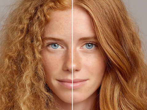 a close-up image highlighting the difference in hair texture: on one side, rough and frizzy; on the other, sleek and glossy after using a hair smoothing product.