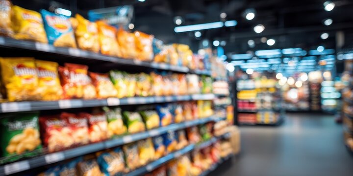 Blurry supermarket aisle with snack food displays
