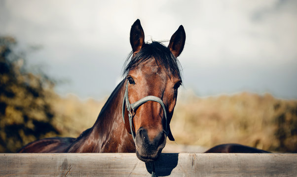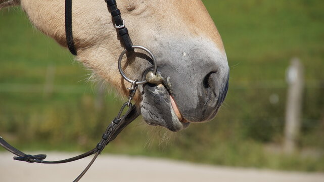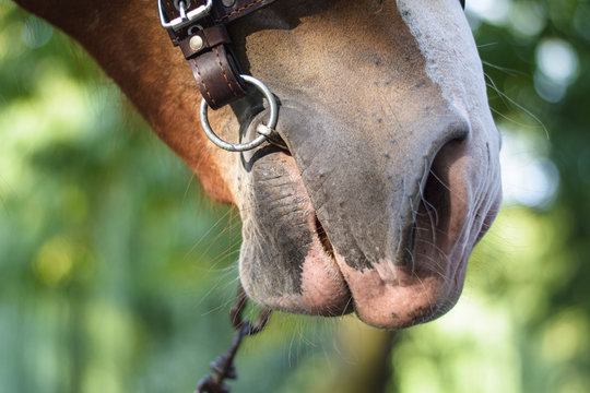 Horse face in bridle. Nostrils of animal with snaffle in mouth. Muzzle close-up. Green natural background. Farm and recreation, horse riding, sports