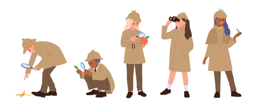 Smart children detectives cartoon characters wearing cute hat and coat isolated set on white