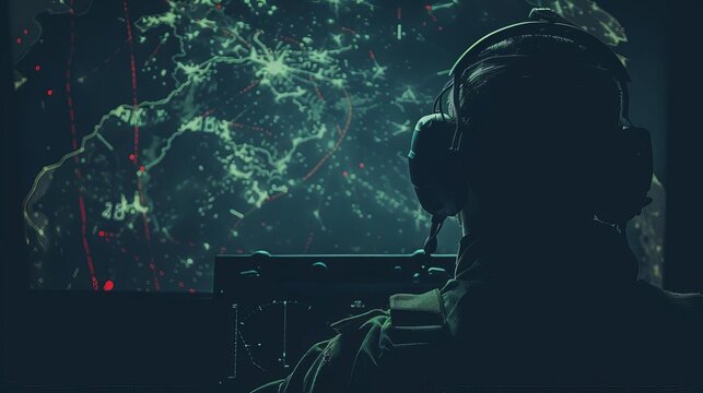 Silhouetted soldier monitoring global data on a digital screen, emphasizing cybersecurity and military intelligence over a dark background.