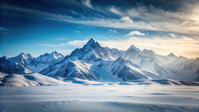 A majestic snow capped mountain peak rises towards the sky in the distance background, Bright & misty mountain beautiful nature background, majestic and tranquil, Generative AI
