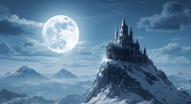 Majestic castle perched on a snow capped mountain under the radiant glow of a full moon