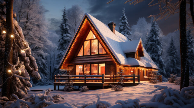 A cozy wooden house covered in snow in winter forest with the lights turn on