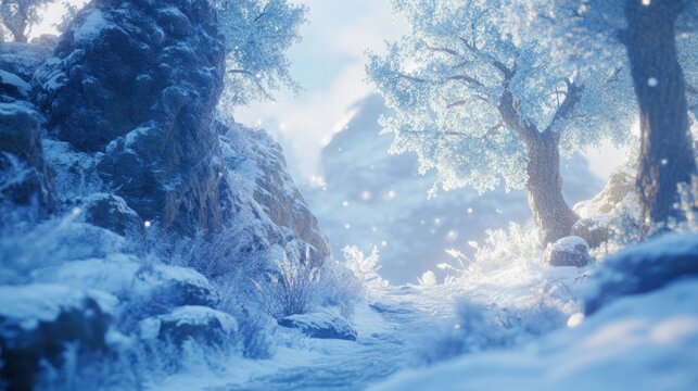 Serene Snowy Highway Adventure Concept. A serene winter road surrounded by snow-covered trees and mountains under a bright sun, winter snow highway landscape