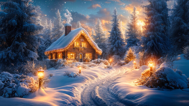 Winter landscape in the forest at sunset. The first snow in the forest. Footprints in the snow in a pine forest. Snowy winter forest with snow covered trees and rays of sun