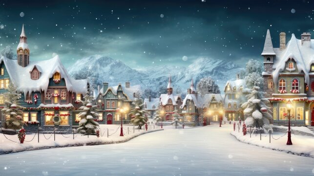 Snowy winter village at night with festive lights