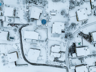 Aerial view of town with snow covered houses. Roof tops with snow on residential buildings in Switzerland.