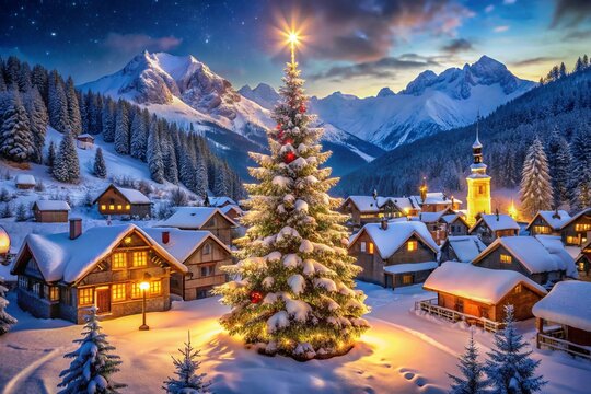 Snow covered village in winter night with decorated christmas tree in the middle european resort in the mountains glowing warm lights from houses and starry sky