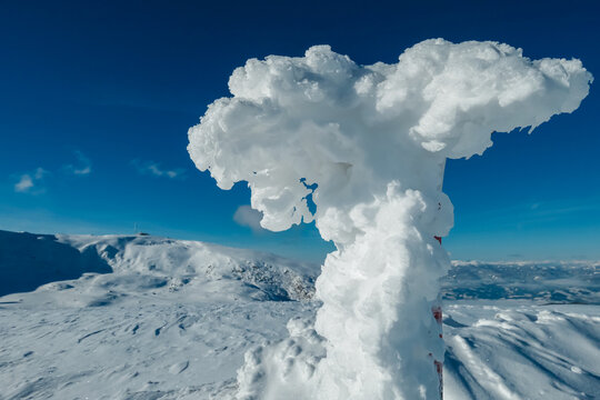 Frozen fence forming sculptures on snow covered alpine meadow with scenic view of landscape of Kor Alps, Lavanttal Alps, Carinthia Styria, Austria. Winter wonderland Austrian Alps. Tranquil atmosphere