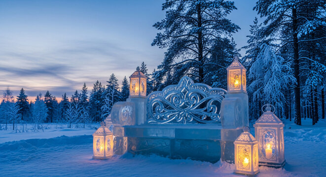 Ice and snow sculptures with glowing lanterns in winter landscape