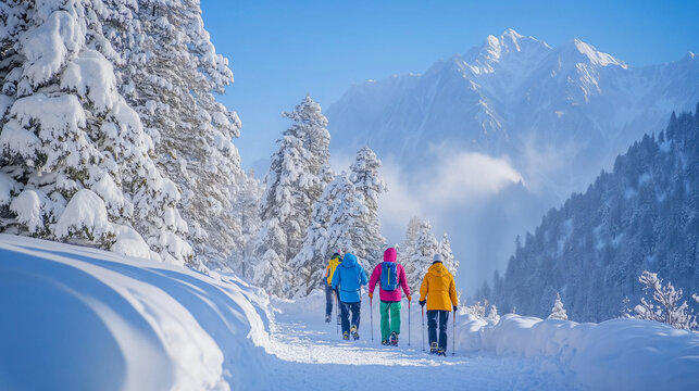 Snowshoe walkers running in powder snow with beautiful sunrise light.