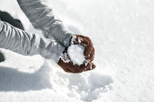 Woman forming a snowball for a funny fight, Winter game in the snow