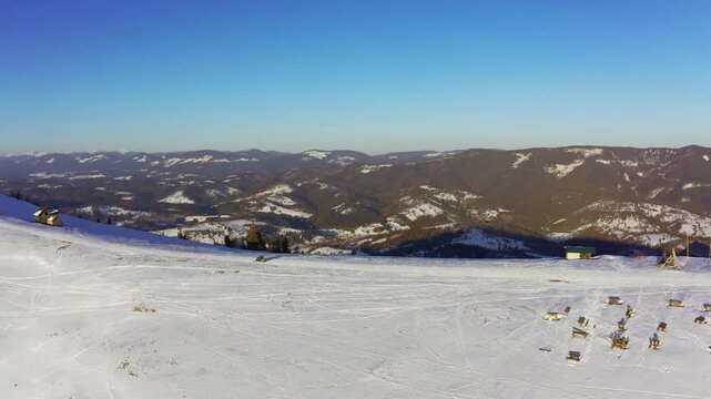 Old ski station on a snowy mountain slope with a lot of people on skis and snowboards