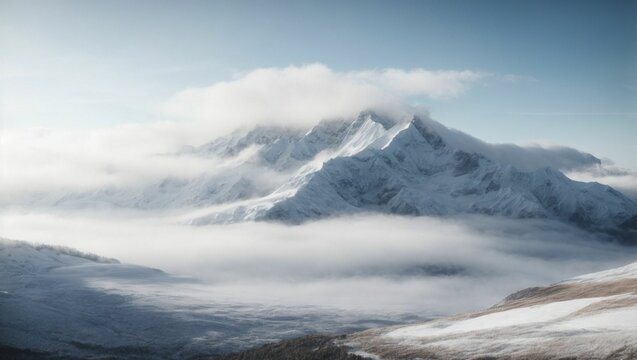 A panoramic view of a massive, snowcapped mountain range with clouds swirling around the peaks, overlooking a vast, snow-covered valley