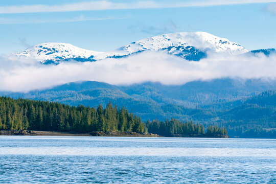 Low-hanging clouds over mountains and forest near Ketchikan, Alaska