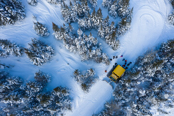 Aerial drone photo of a group of skiers and snowboarders in a snow cat in the Chic Choc Mountains of Quebec, Canada