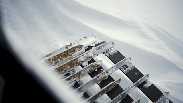 People in the back of a snowcat are driving along a snowy road. Soft focus. ..