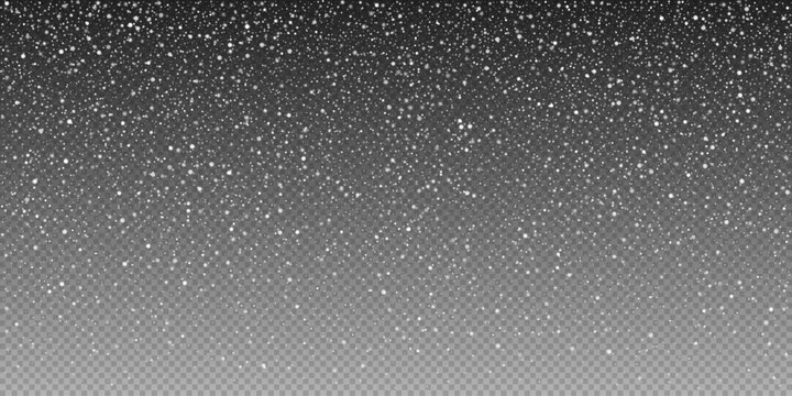 Frosty snowflakes falling on transparent background. Fine winter snowfall, delicate snow flakes creating a calm festive atmosphere. Perfect for Christmas or winter scenes designs, holiday cards.
