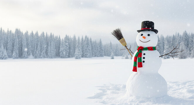 Charming snowman with snowflake in snowy winter forest scene illustration