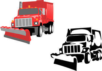 Snow plow truck cleaning road removing snow in a flat style on blue background. Vector illustration in cartoon style.