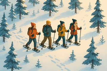 Snowshoe walkers running in powder snow with beautiful sunrise light.